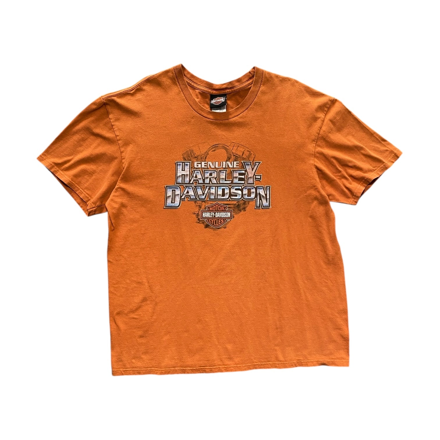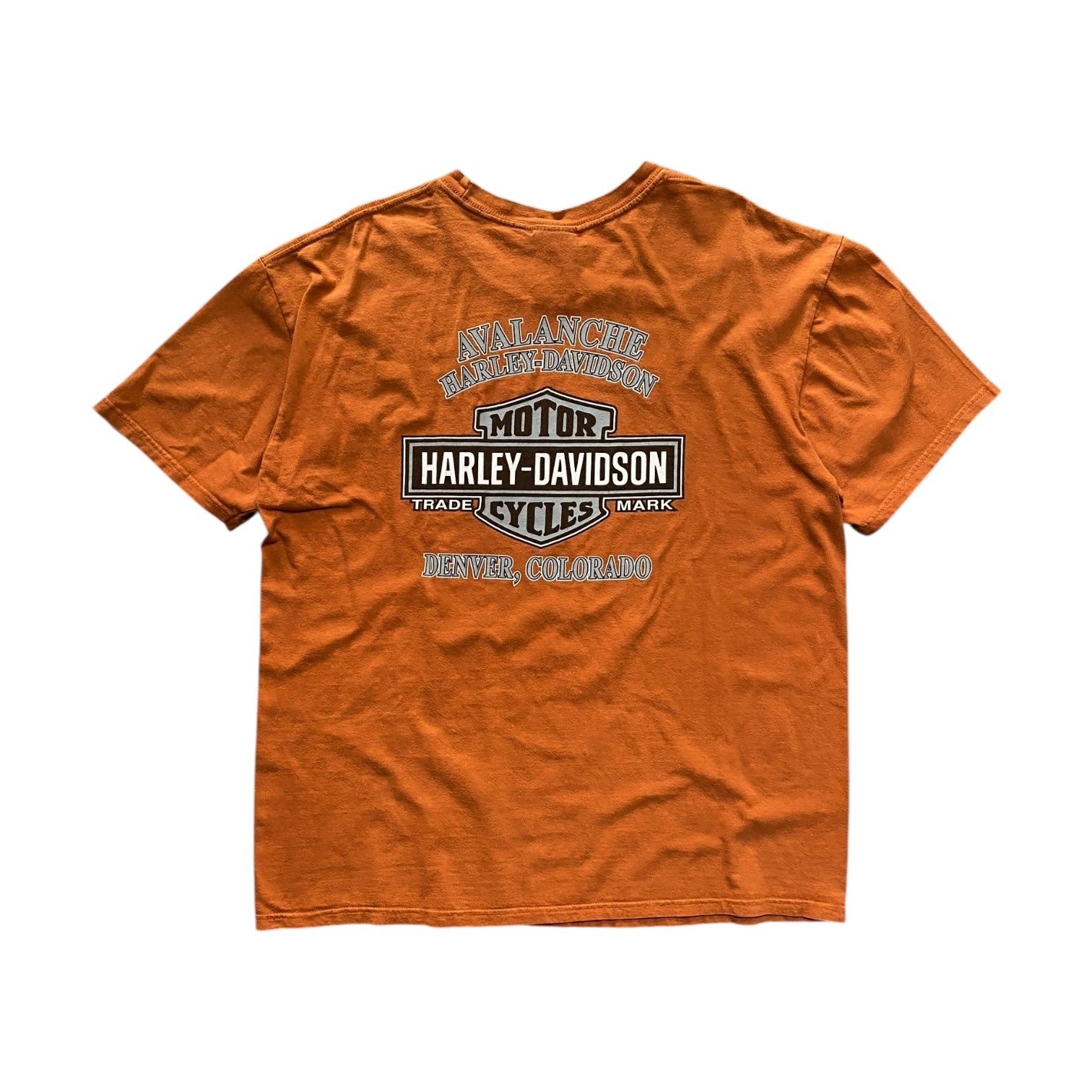 Classic 2005 Harley Davidson Denver, Colorado orange tee showcasing vintage biker style with bold graphics.
