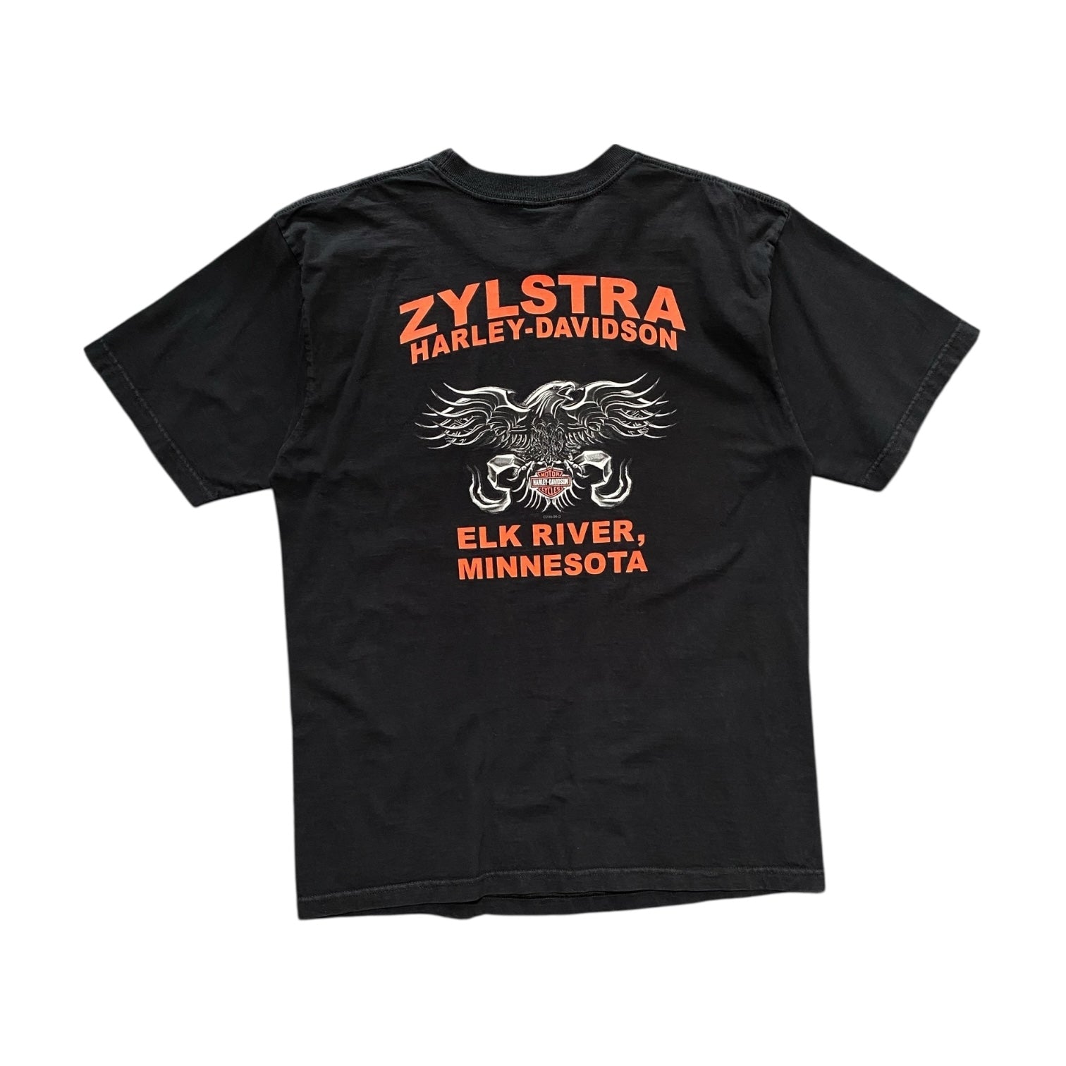 Vintage 2005 Harley Davidson Zylstra black tee showcasing bold biker graphics with classic style.