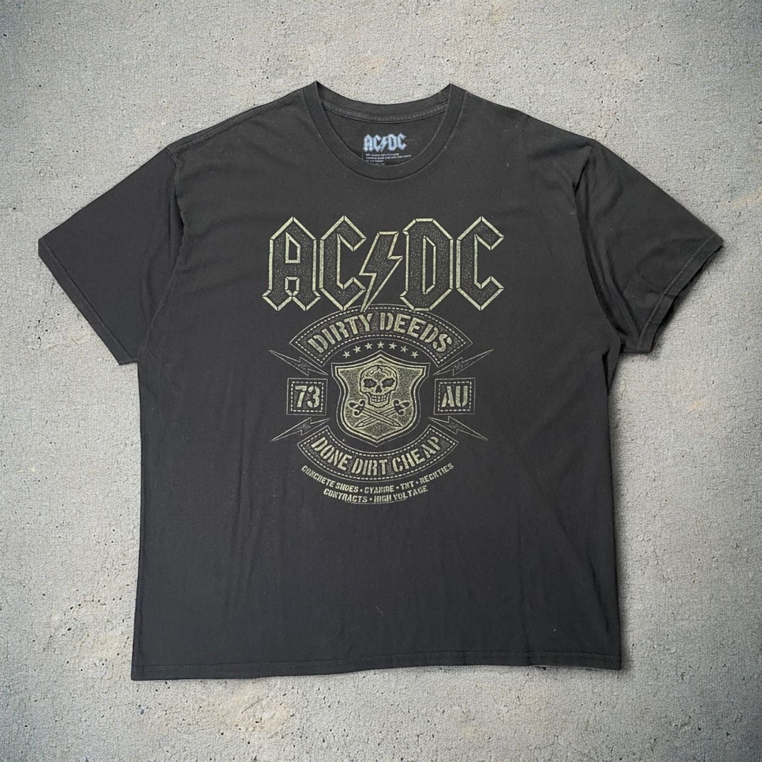 AC/DC Dirty Deeds T-shirt featuring iconic band graphics and vintage rock style. A must-have for music fans and streetwear enthusiasts alike.