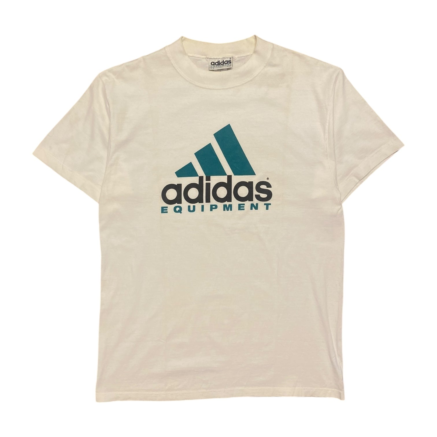 A timeless staple with subtle athletic heritage, this Adidas Equipment white T-shirt channels minimalist 90s sportswear. Light staining and yellowing add vintage character for an authentic worn-in look.