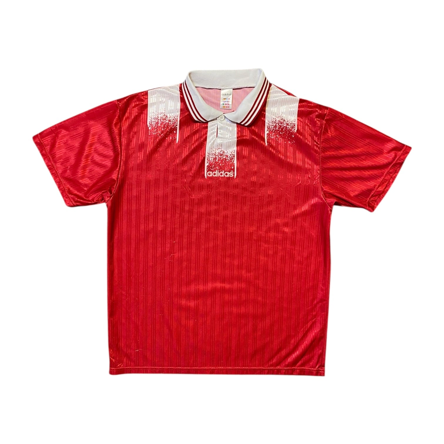 Sporty and bold, this Adidas red football jersey channels classic athletic energy with a vibrant red base and iconic branding. Its breathable fabric and relaxed fit make it perfect for game days or casual streetwear.