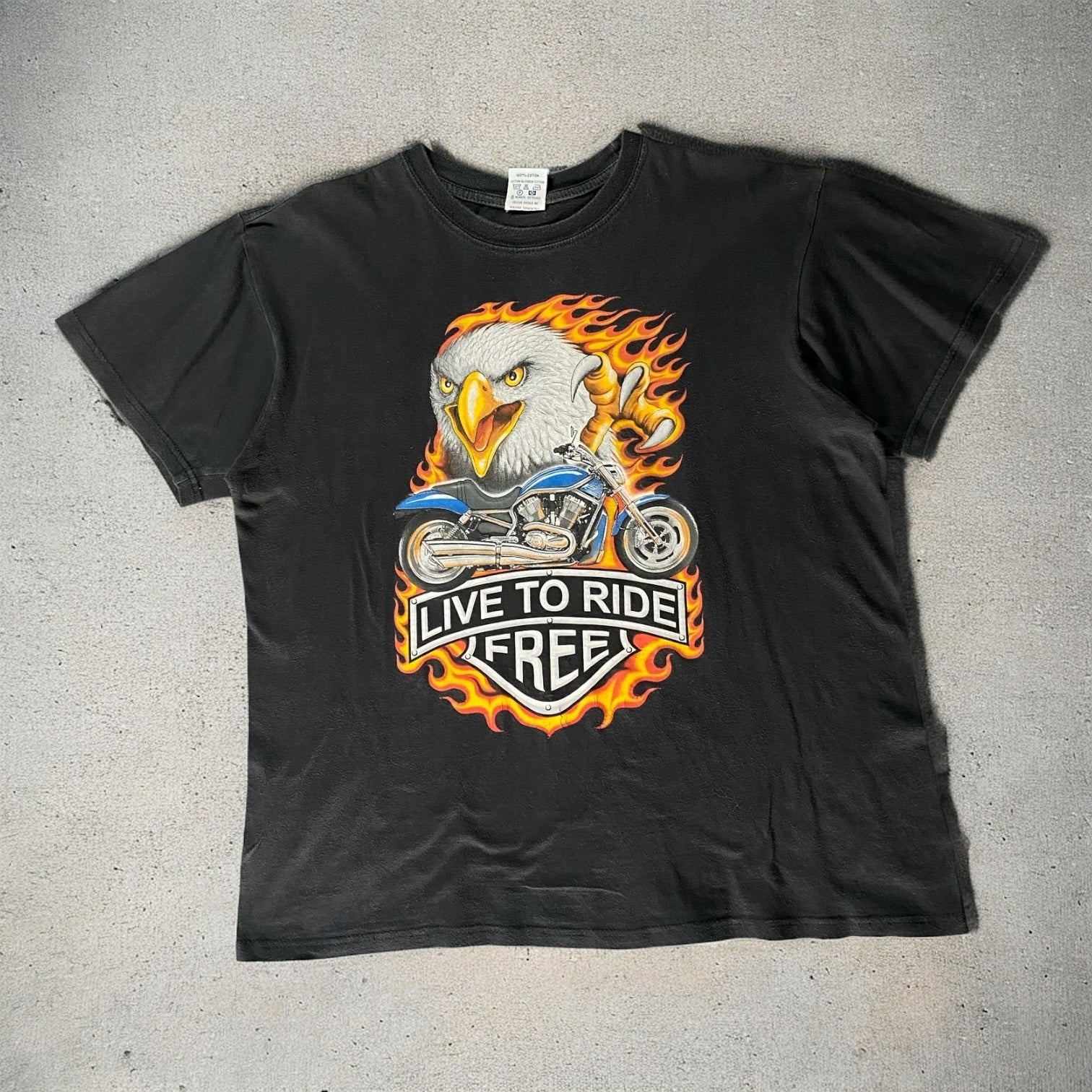 Classic black tee featuring the Live To Ride Free graphic from American Zone, offering a relaxed large fit with vintage biker-inspired style.