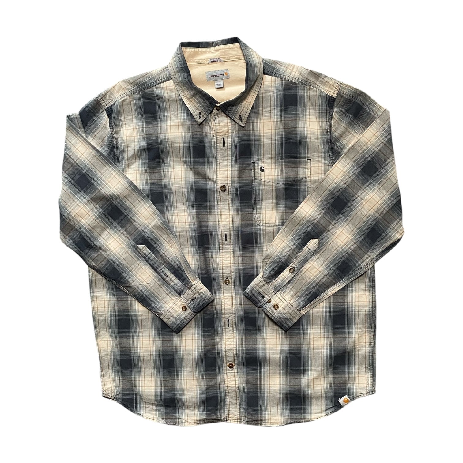 Durable and stylish, this Carhartt beige and blue chequered button-up shirt combines rugged workwear with a casual, timeless look.