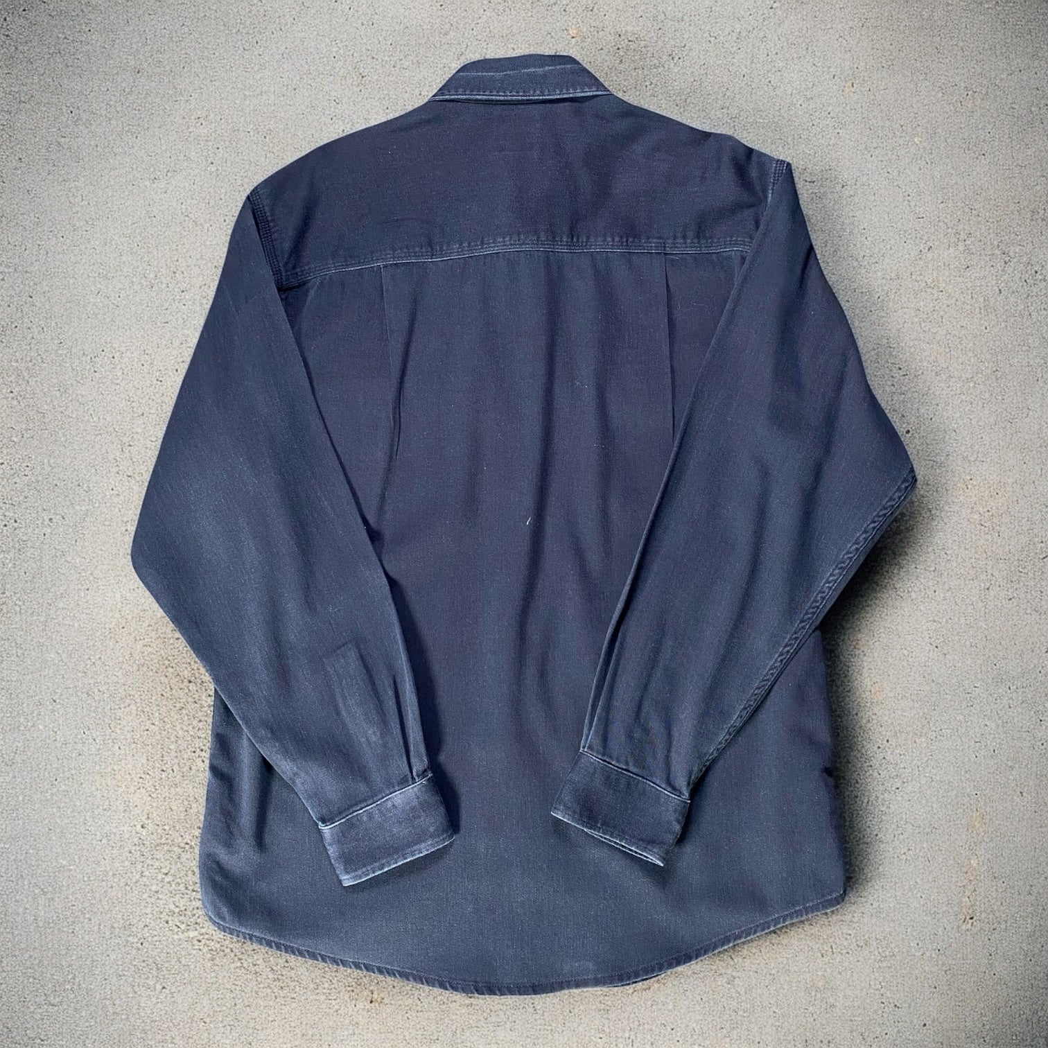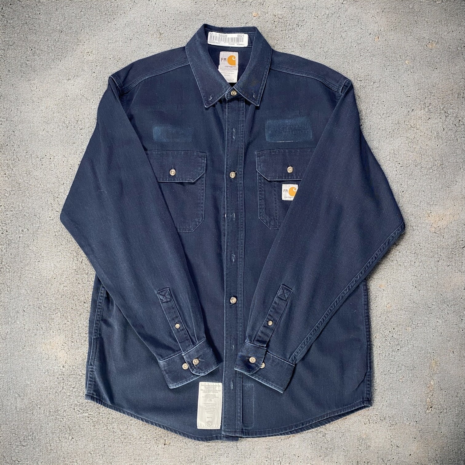 Carhartt Flame-Resistant Navy Blue Shirt featuring durable workwear design and classic style. Perfect for both functional wear and streetwear-inspired layering.