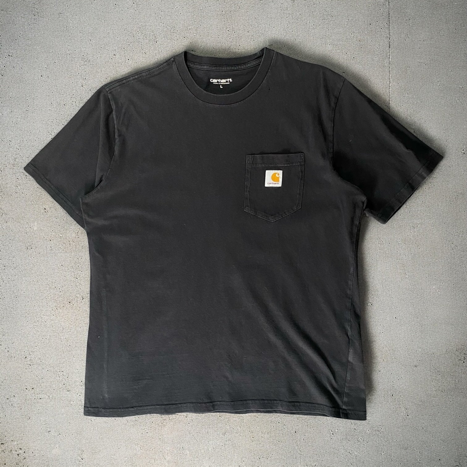 Classic black Carhartt tee with a front pocket, offering a relaxed Large fit and rugged workwear-inspired style.