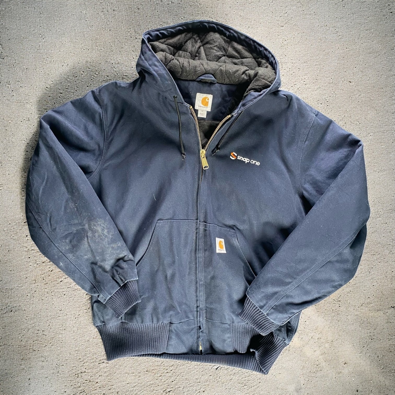 Carhartt Snap One Navy Hoodie — a classic, heavyweight hoodie with a clean workwear aesthetic. Comfortable, durable, and ideal for everyday wear with subtle character from natural aging.