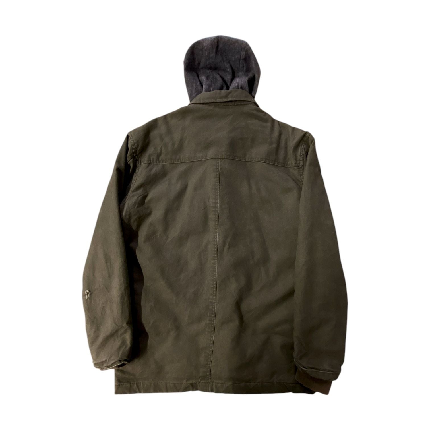 This jacket is in good condition with minimal signs of wear & tear. The fabric remains sturdy regardless and the construction continues to provide reliable protection against the cold. The attached hood is intact and offers added comfort during colder weather.