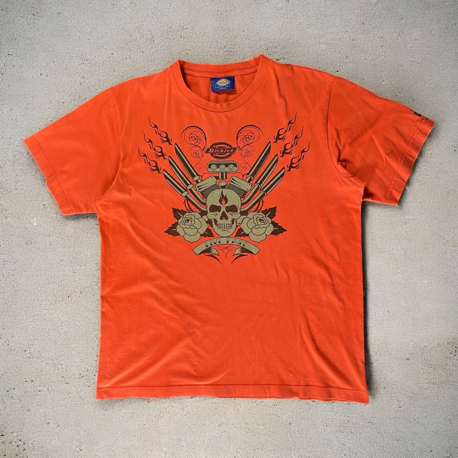 Classic orange Dickies tee featuring the Live Fast graphic, offering vintage streetwear style with a bold, casual look.