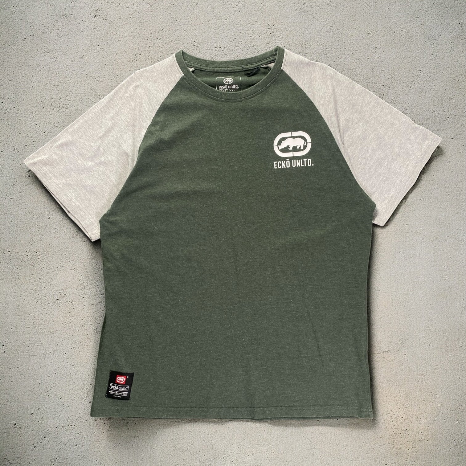 Bold and casual, this Ecko Unltd green and gray tee features a striking graphic design with a comfortable large fit.
