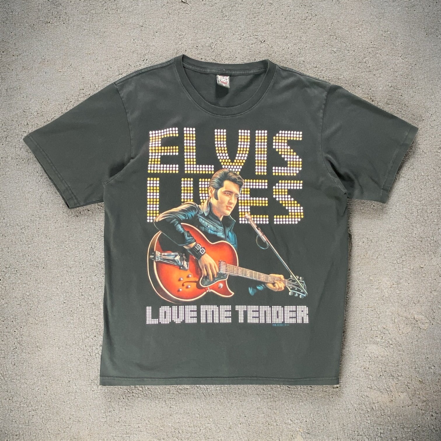 Elvis Presley Love Me Tender Black T-shirt — a tribute to the King of Rock ’n’ Roll. Featuring a vintage graphic of one of his most iconic songs, this tee carries timeless music history with classic style.