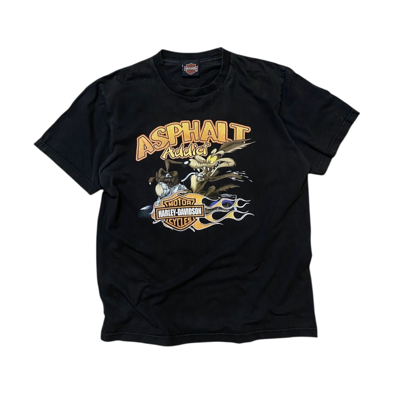 Raw and rebellious, this Harley Davidson Asphalt Addict black T-shirt features bold graphics that capture the spirit of the open road and biker culture.