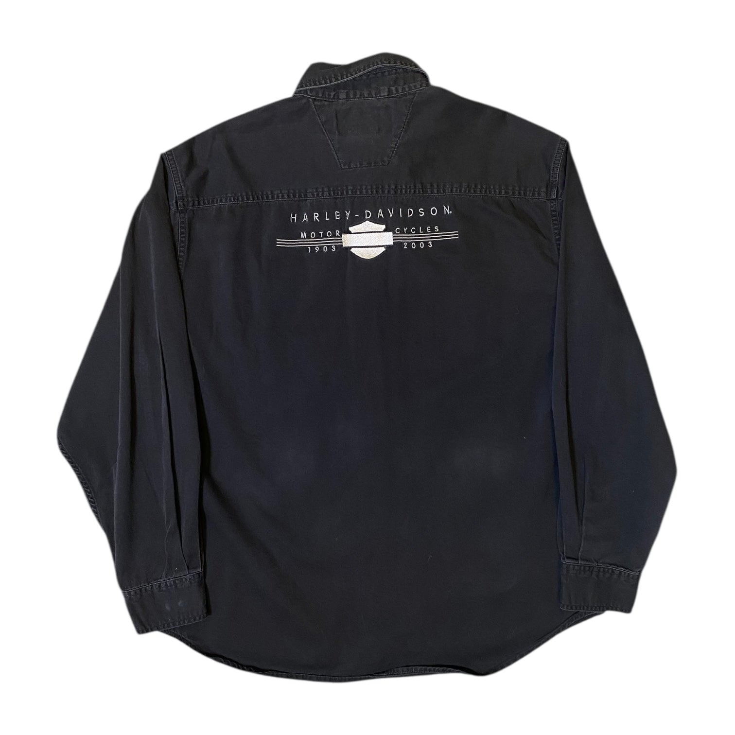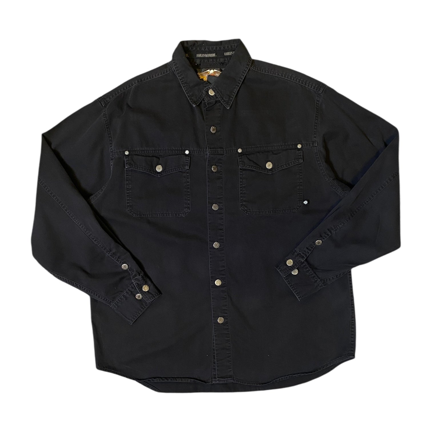 A no-frills essential with attitude, this Harley Davidson black button-up shirt channels the brand's iconic road-ready spirit. Designed for both durability and everyday wear, it's a staple piece that transitions seamlessly from bike rides to casual nights out.