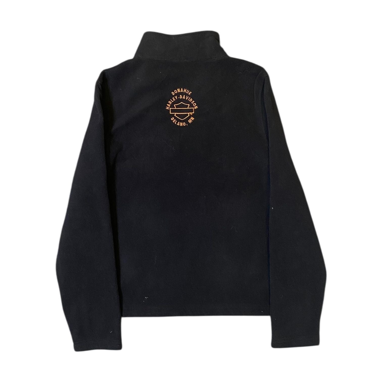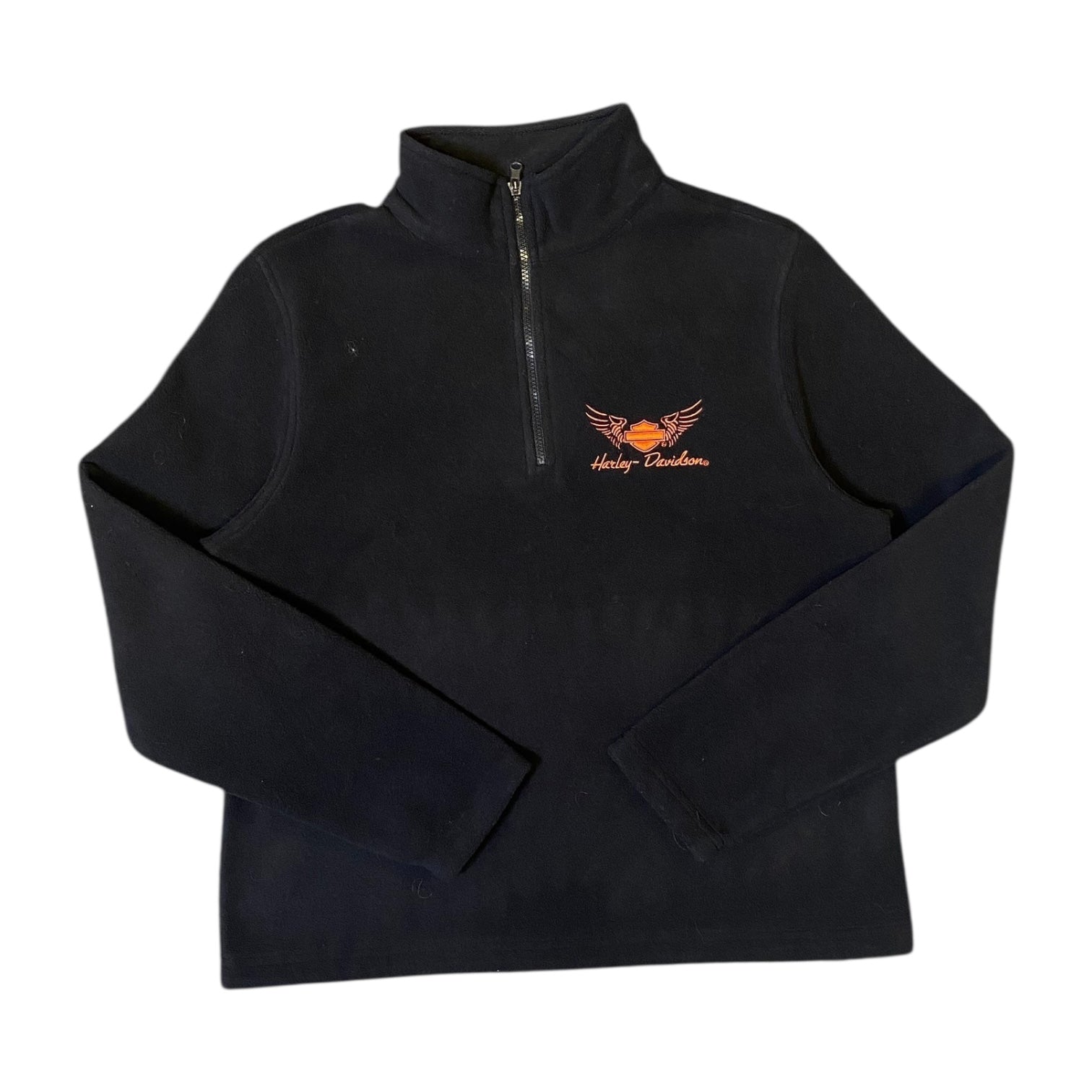 Understated yet unmistakable, this Harley Davidson black quarter zip sweater brings together rugged utility and timeless appeal. With its clean silhouette and minimal branding, it’s the kind of versatile piece that slips seamlessly into both vintage and contemporary wardrobes.