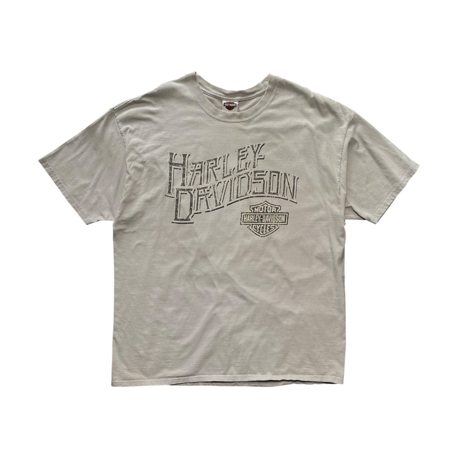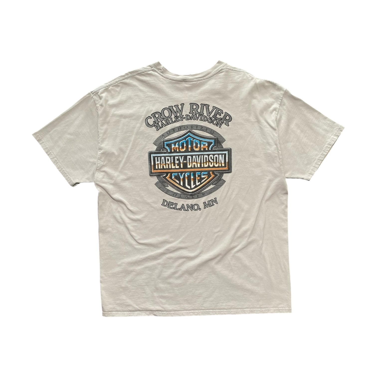 Classic Harley Davidson Crow River grey tee with a worn-in look, featuring faded vintage-inspired graphics.