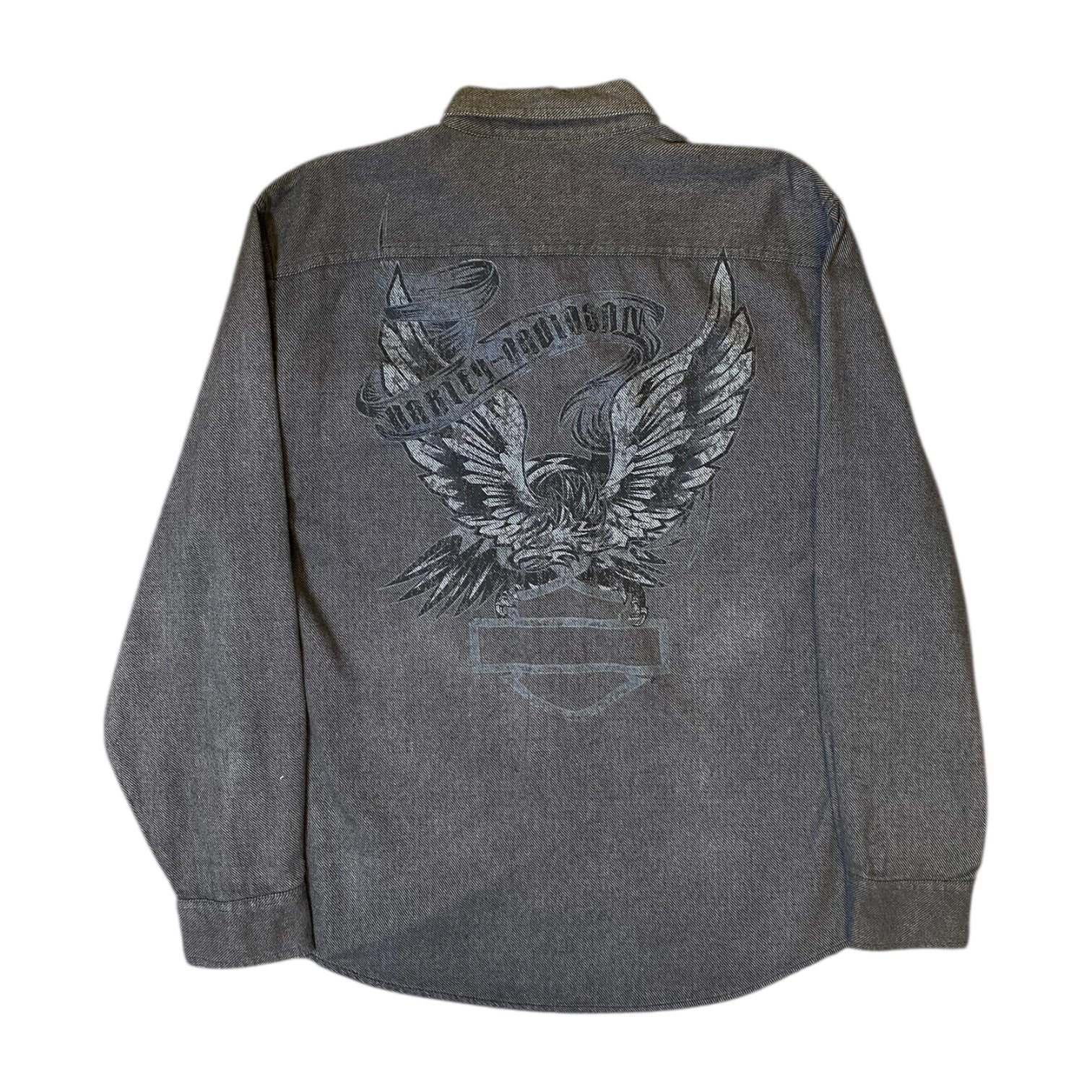 Harley Davidson Grey Button Up Eagle Back Print Shirt
