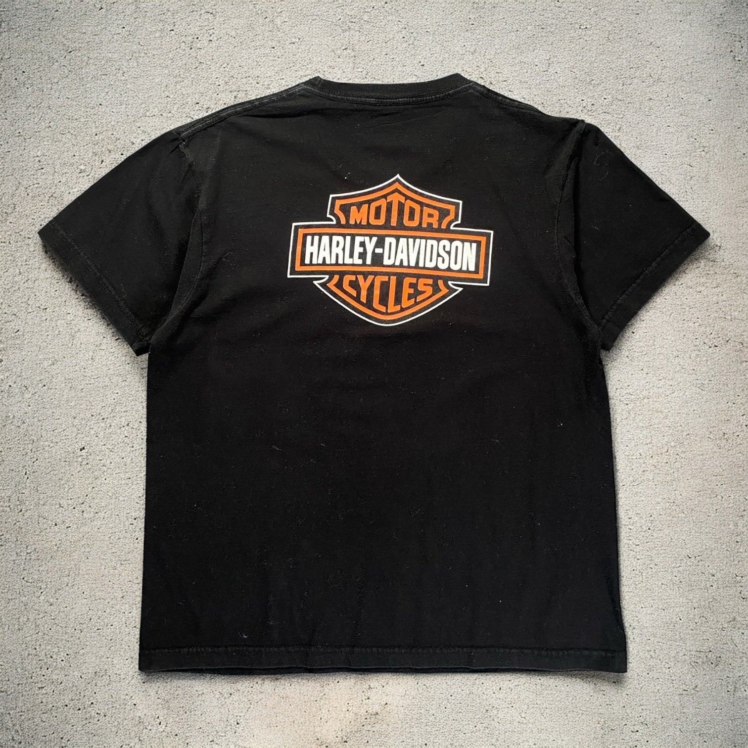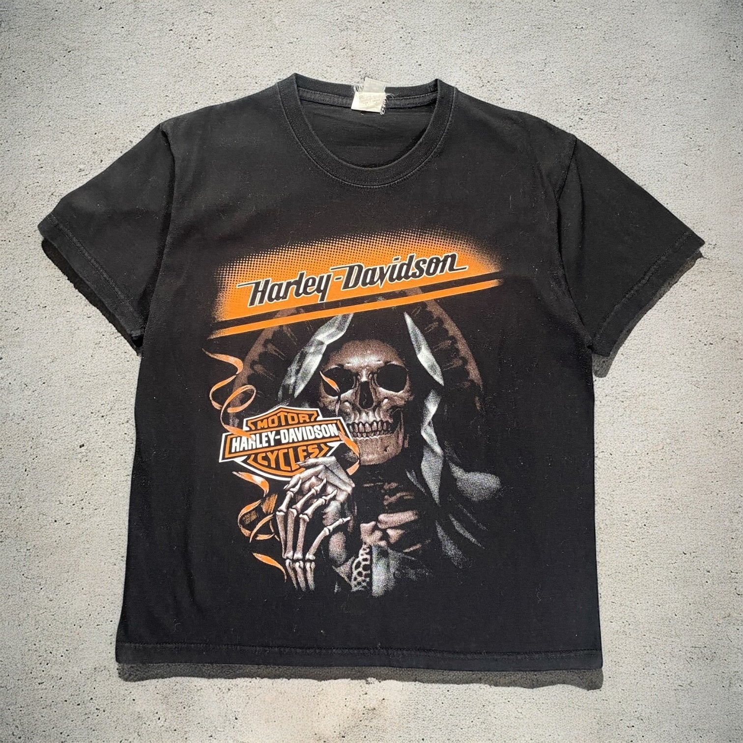 Classic black Harley Davidson tee featuring the Grim Reaper graphic, offering a vintage biker-inspired look with a comfortable fit.