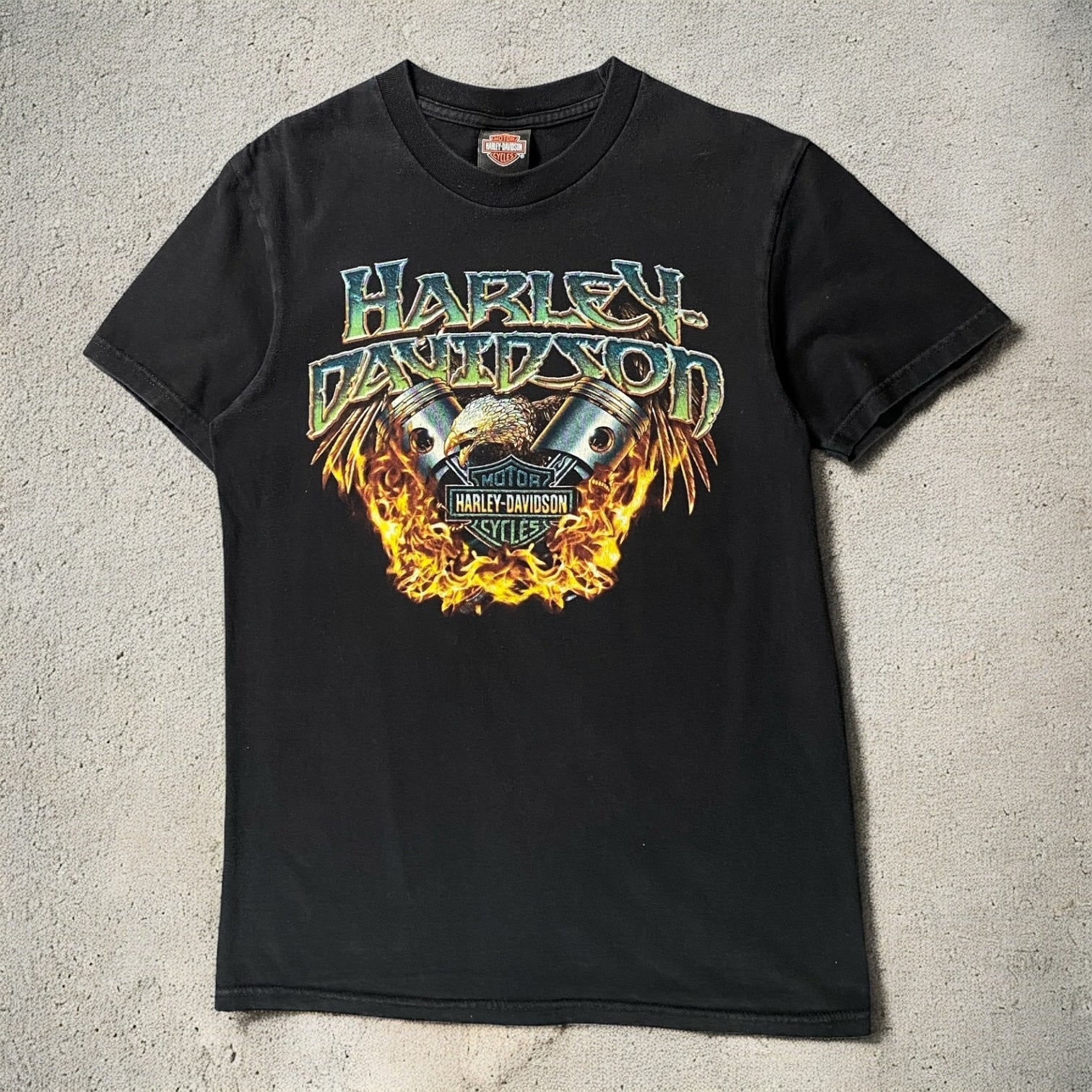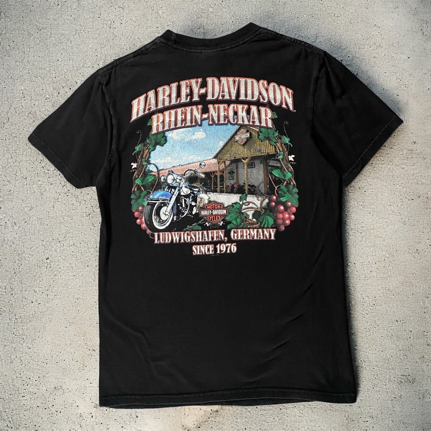 Classic black Harley Davidson tee featuring the Rhein Neckar graphic, offering a vintage biker-inspired look with a comfortable medium fit.