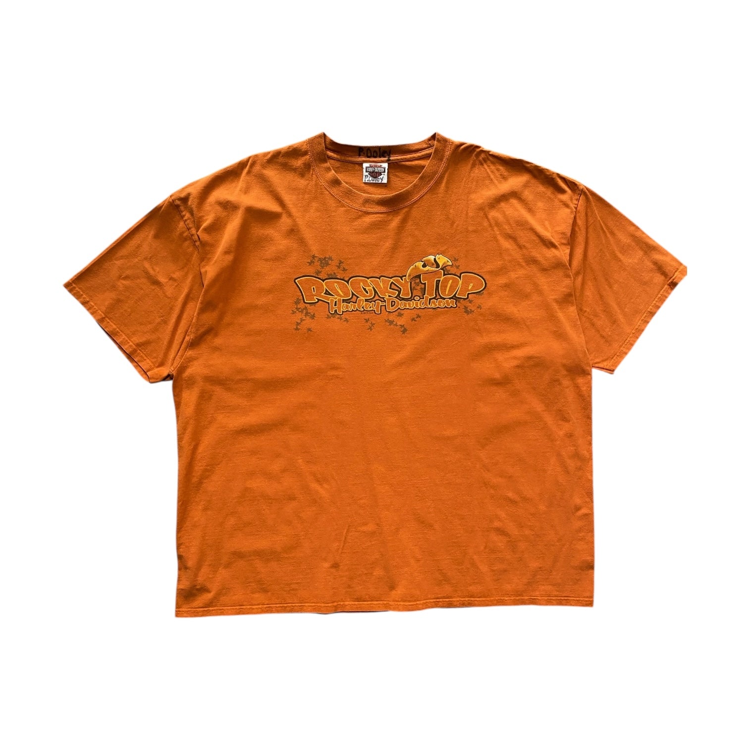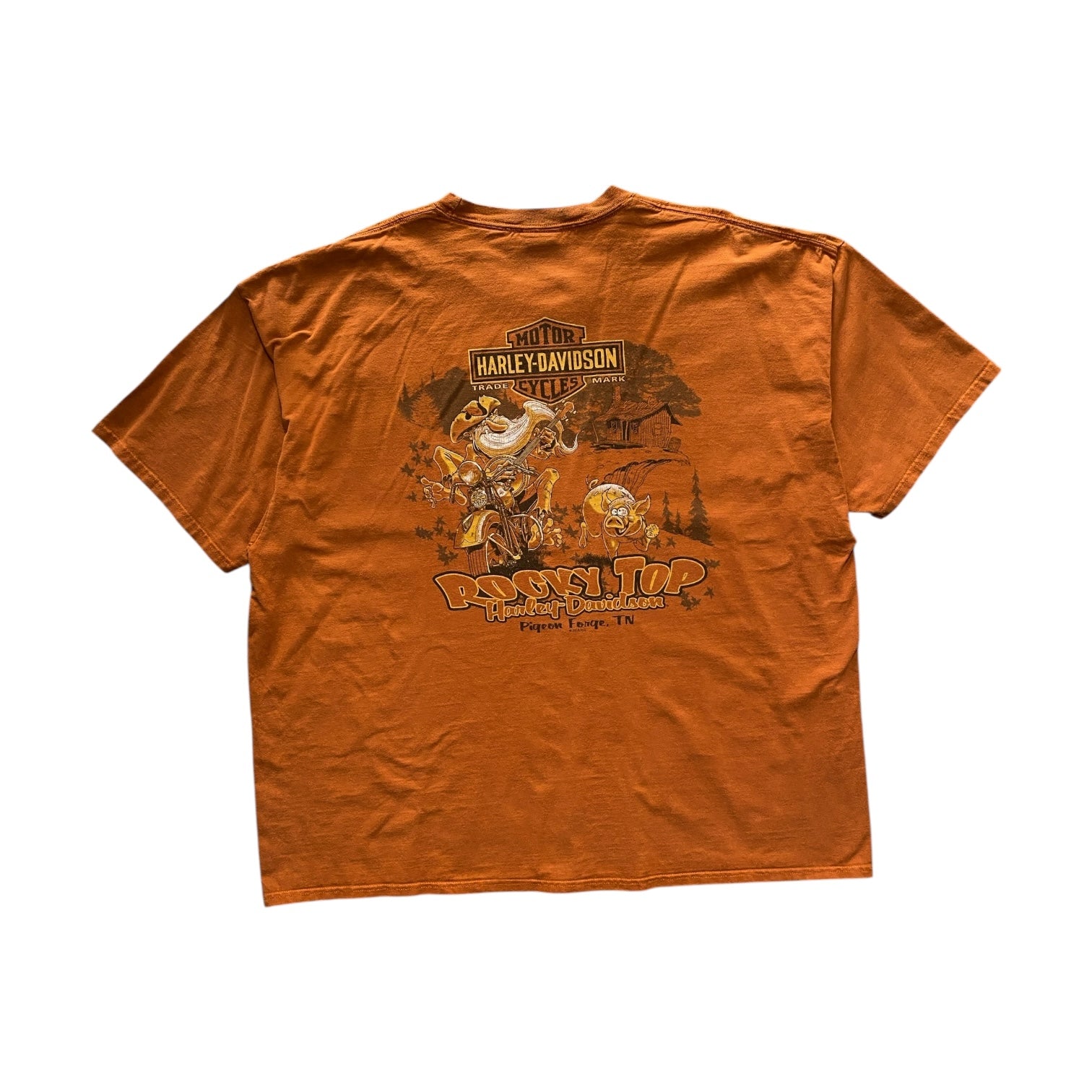 Bold Harley Davidson Rocky Top orange tee showcasing vintage biker style with vibrant graphics.