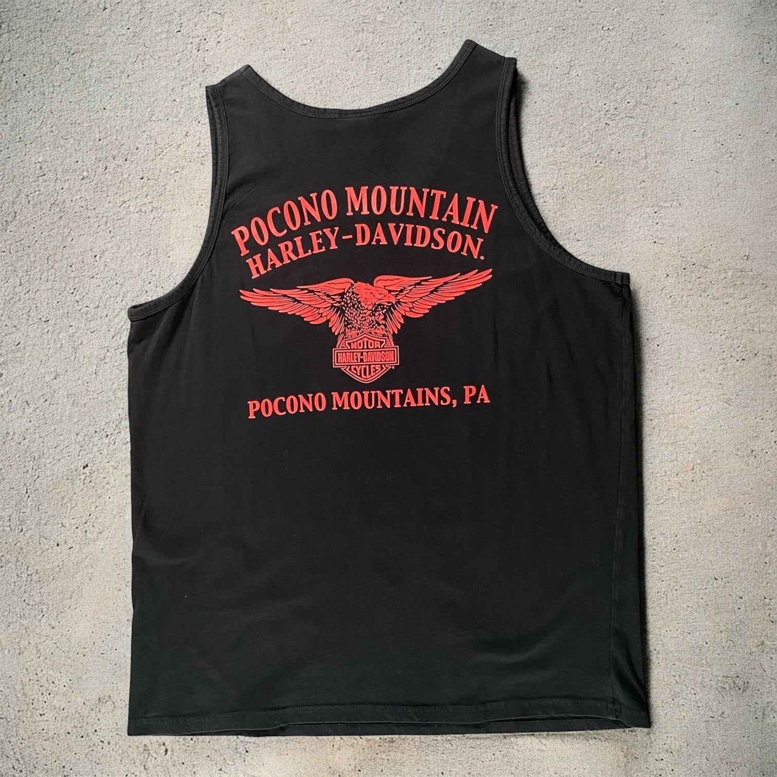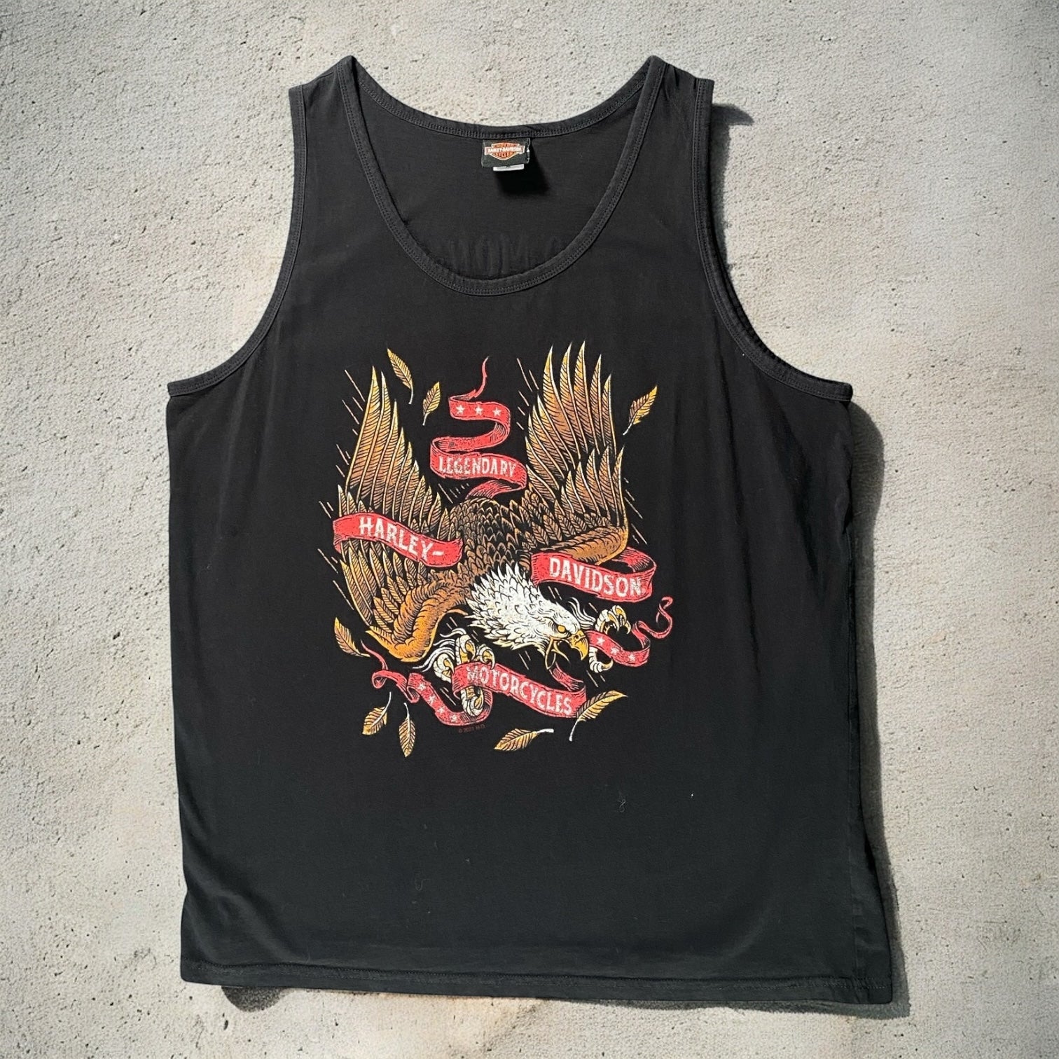 Classic sleeveless Harley Davidson tank featuring bold graphics, offering a relaxed fit and vintage biker-inspired style.
