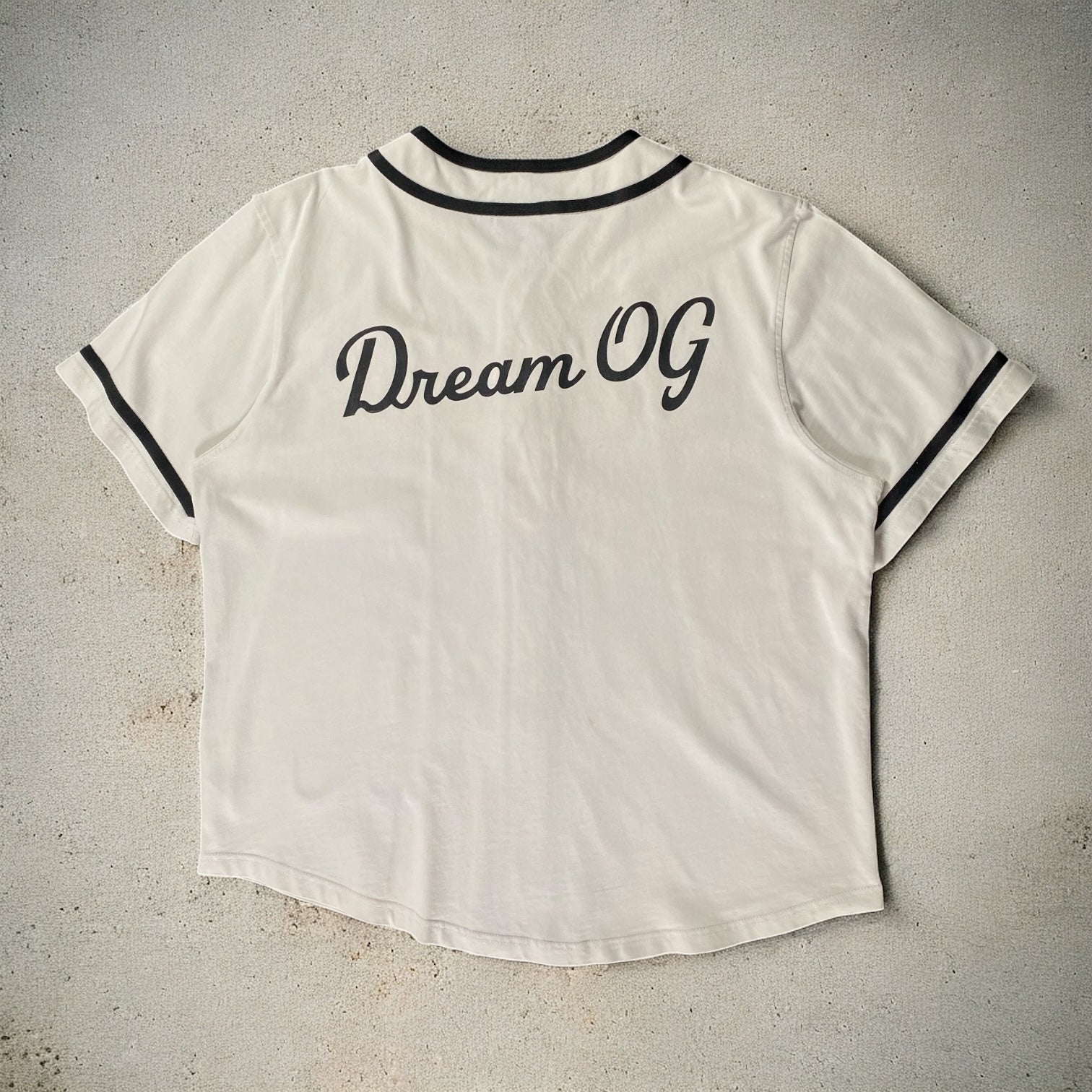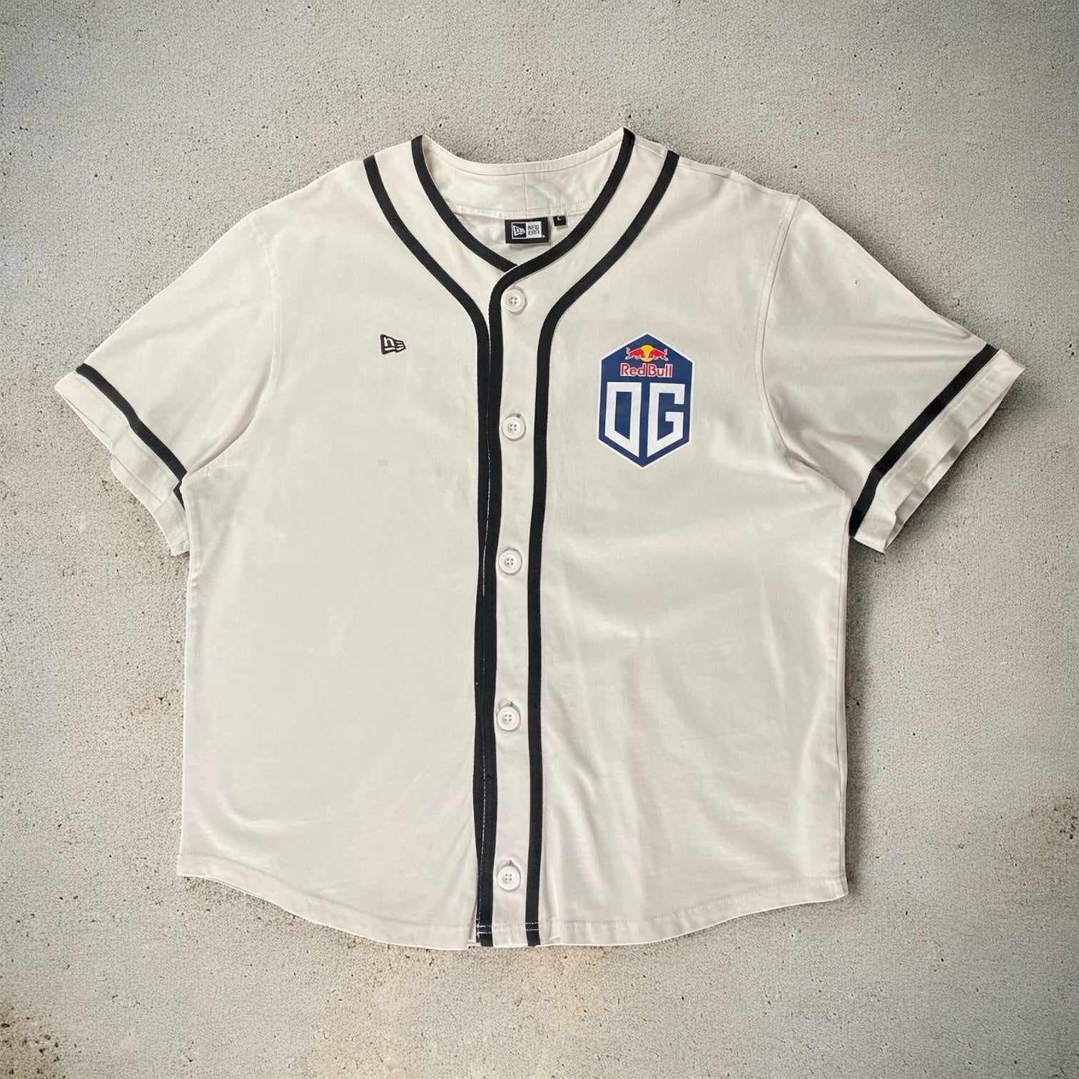 Classic white New Era jersey featuring the Red Bull OG logo, offering a large fit with vintage sportswear style and character from light wear.
