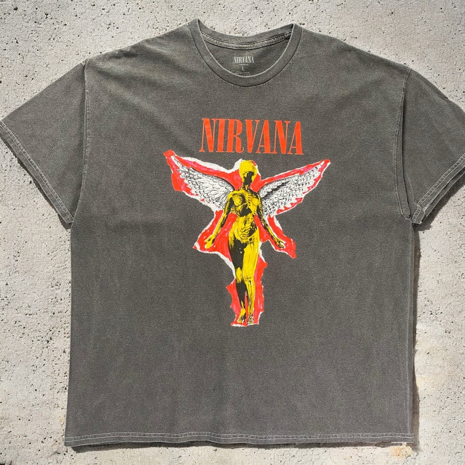 Classic Nirvana tee in dark gray featuring iconic graphics, offering a relaxed vintage fit and timeless streetwear style.