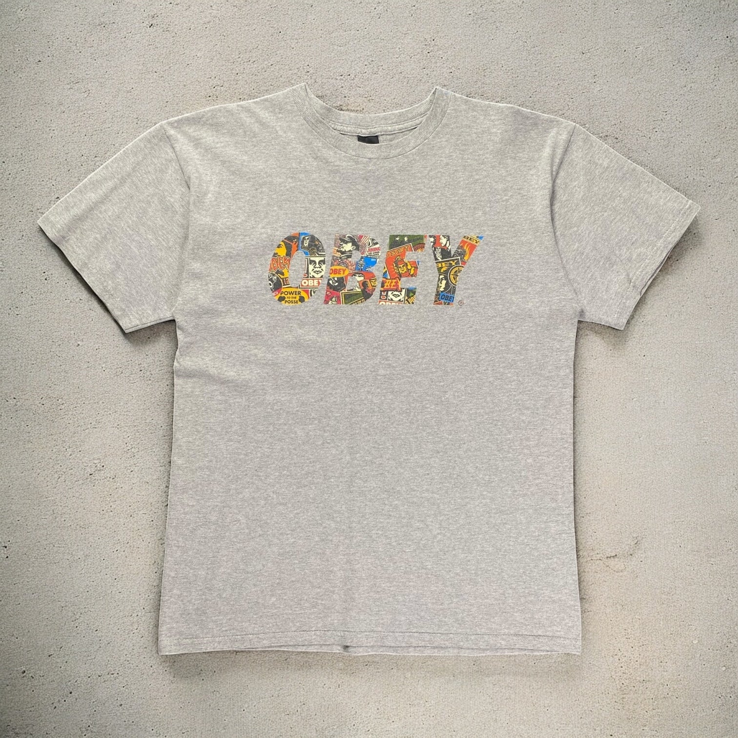Classic gray Obey tee featuring bold streetwear graphics, offering a comfortable fit and casual style.