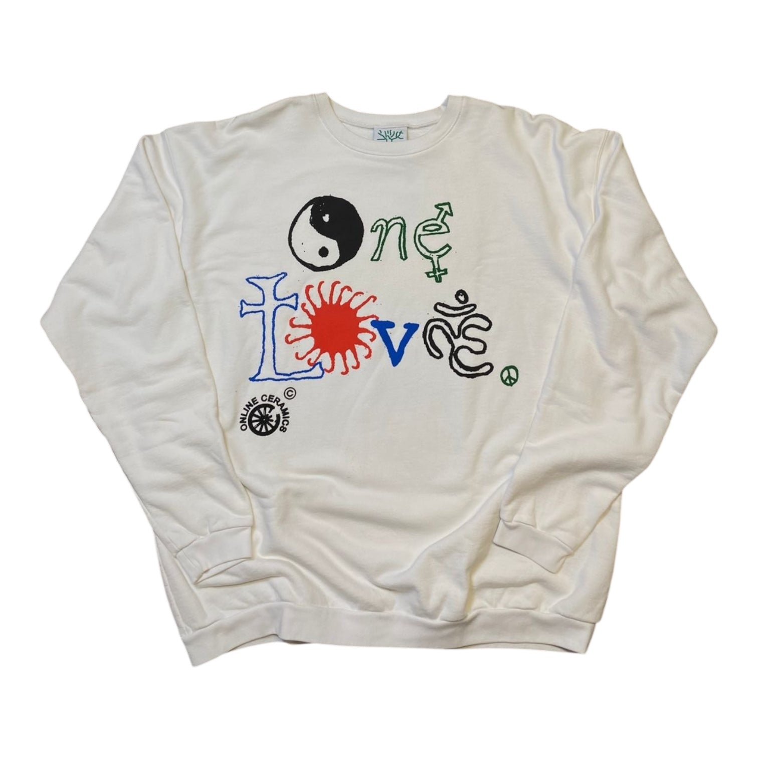 Rooted in mindful optimism, the Online Ceramics One Love white sweater radiates positivity with its clean palette and signature graphics. It’s an oversized essential that bridges laid-back comfort with thoughtful design.