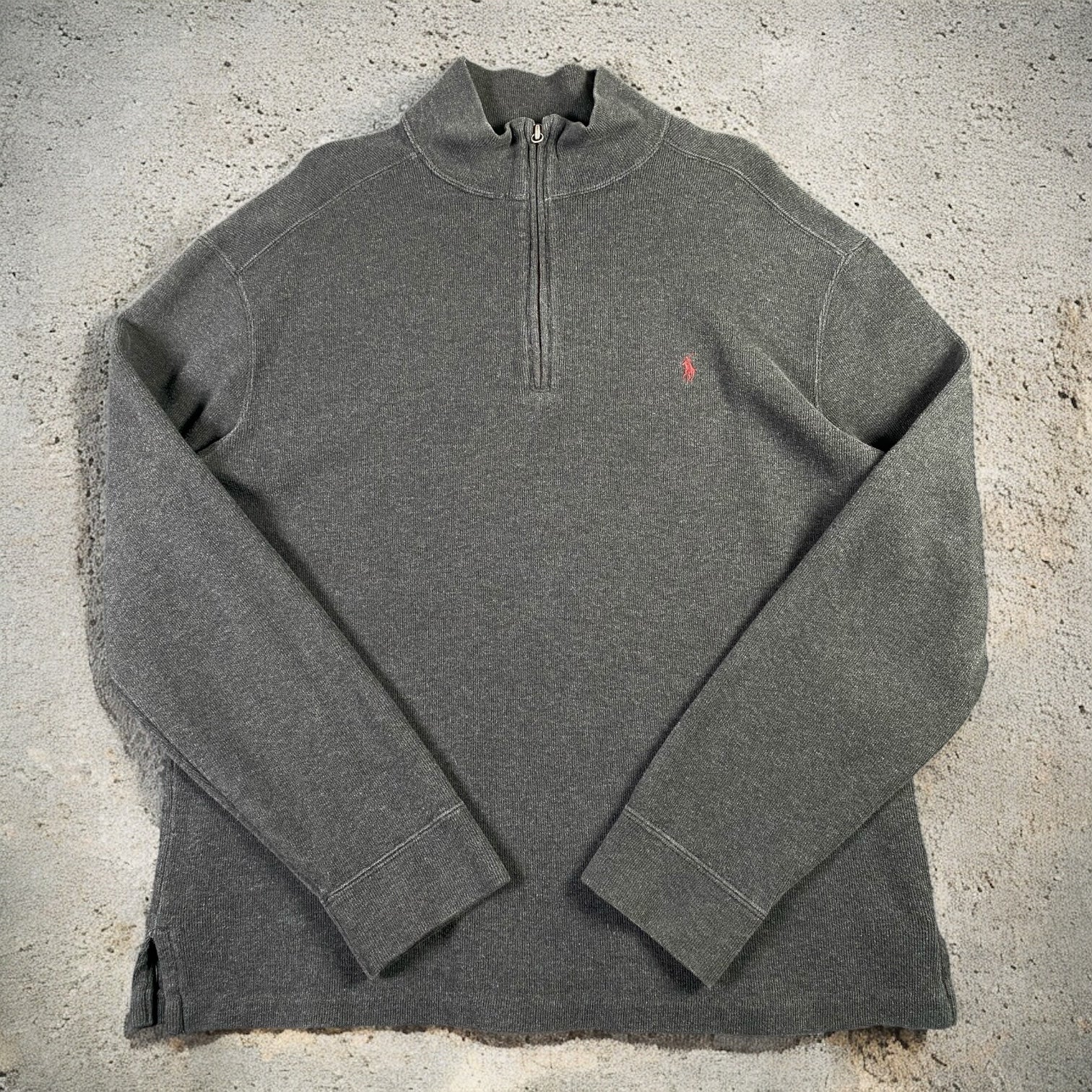 Polo Ralph Lauren Quarter-Zip Long Sleeve Sweater — a timeless dark grey piece accented with a maroon embroidered logo. Designed with a soft knit finish and quarter-zip collar, offering a clean, classic Ralph Lauren look.