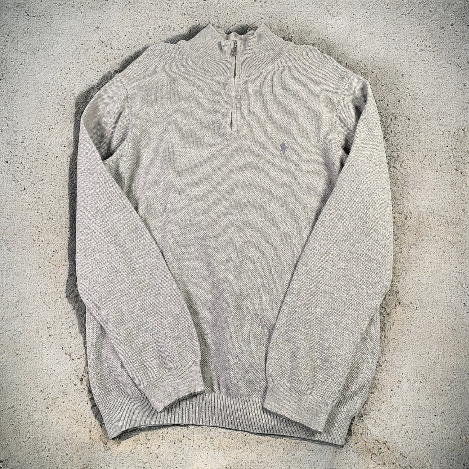 Polo Ralph Lauren Quarter-Zip Long Sleeve Sweater — classic grey with a subtle grey embroidered logo. Soft and cozy, perfect for layering or casual wear while showcasing timeless Polo detailing.
