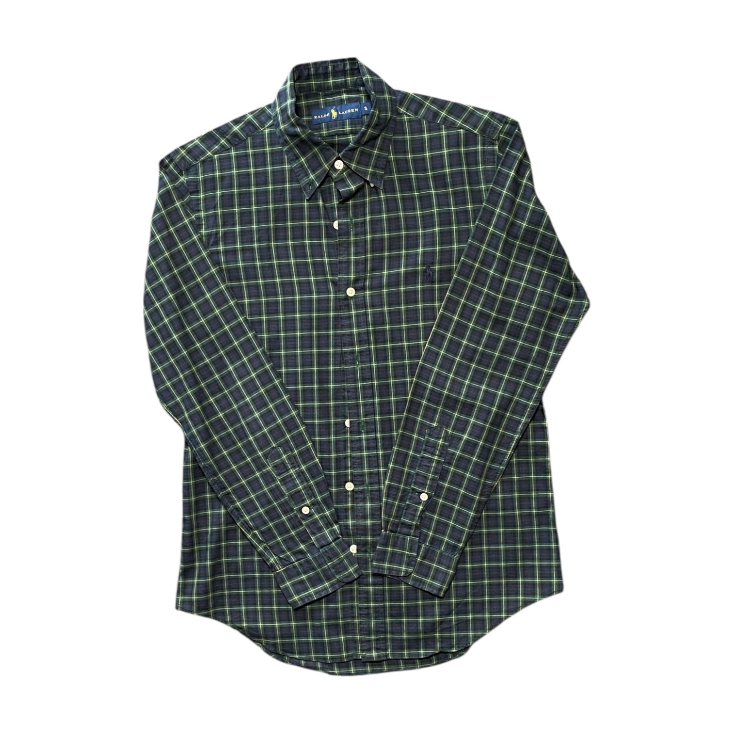 Classic Ralph Lauren button-up shirt featuring a subtle green chequered pattern with a comfortable, tailored fit.