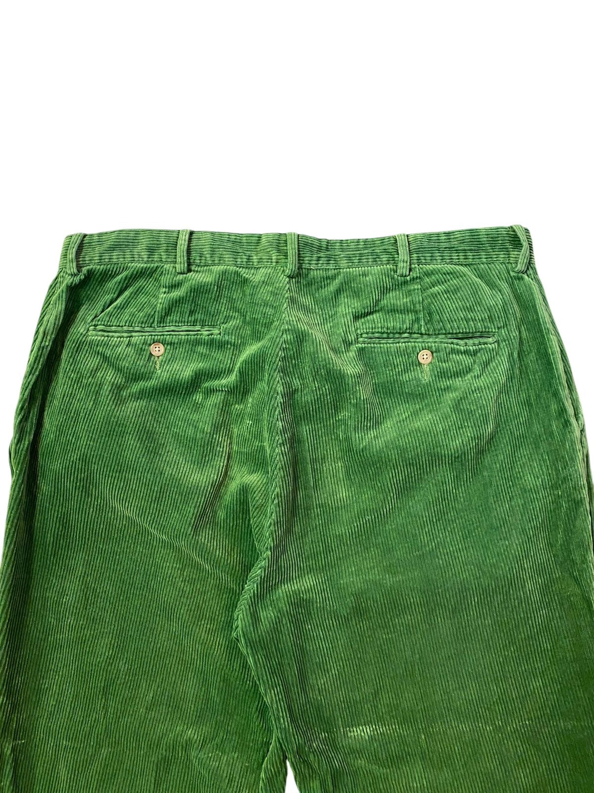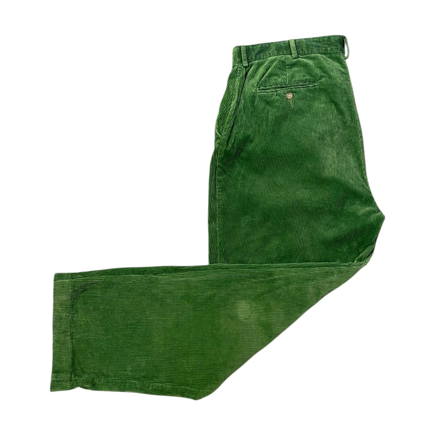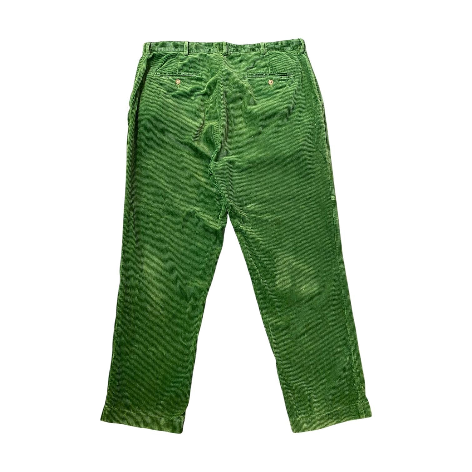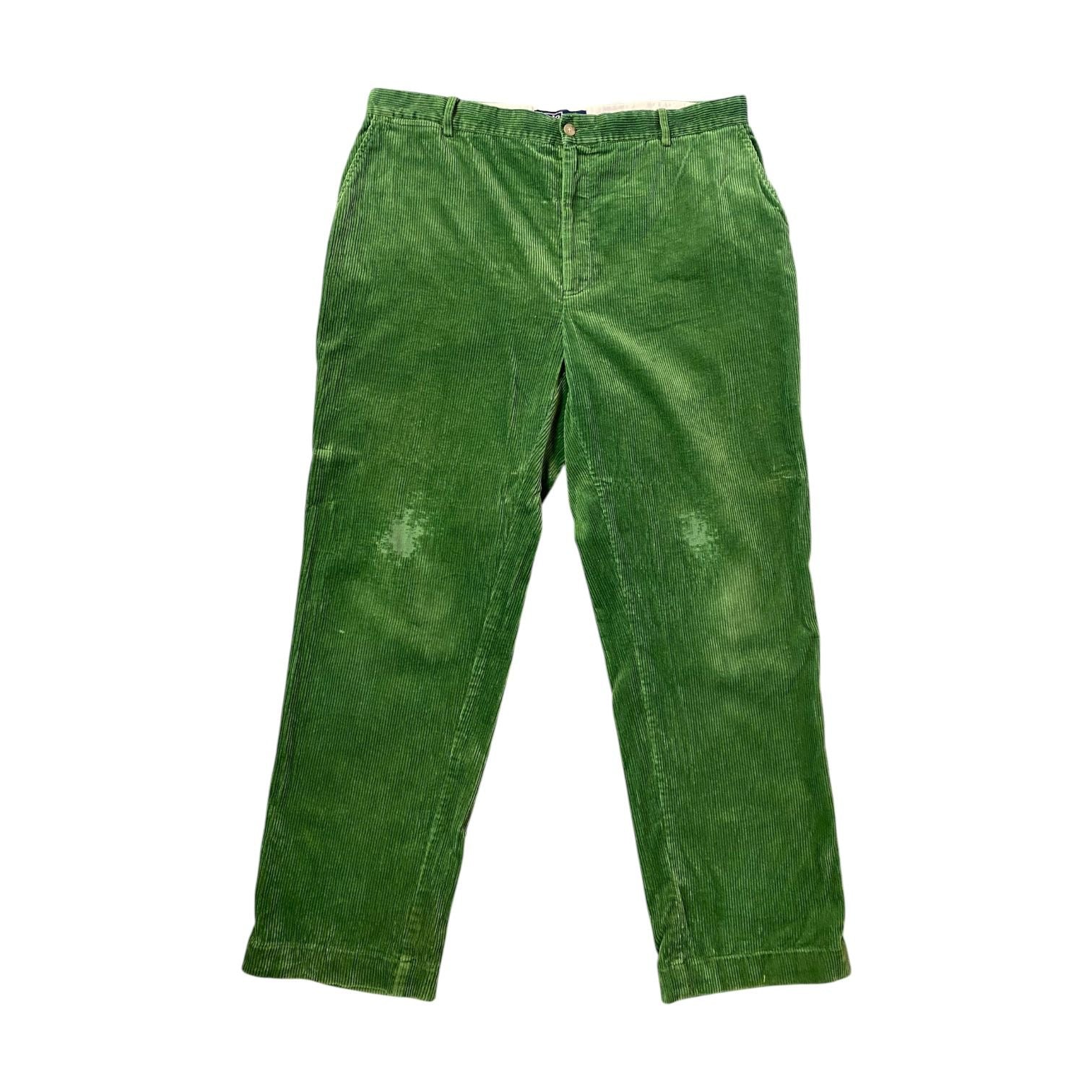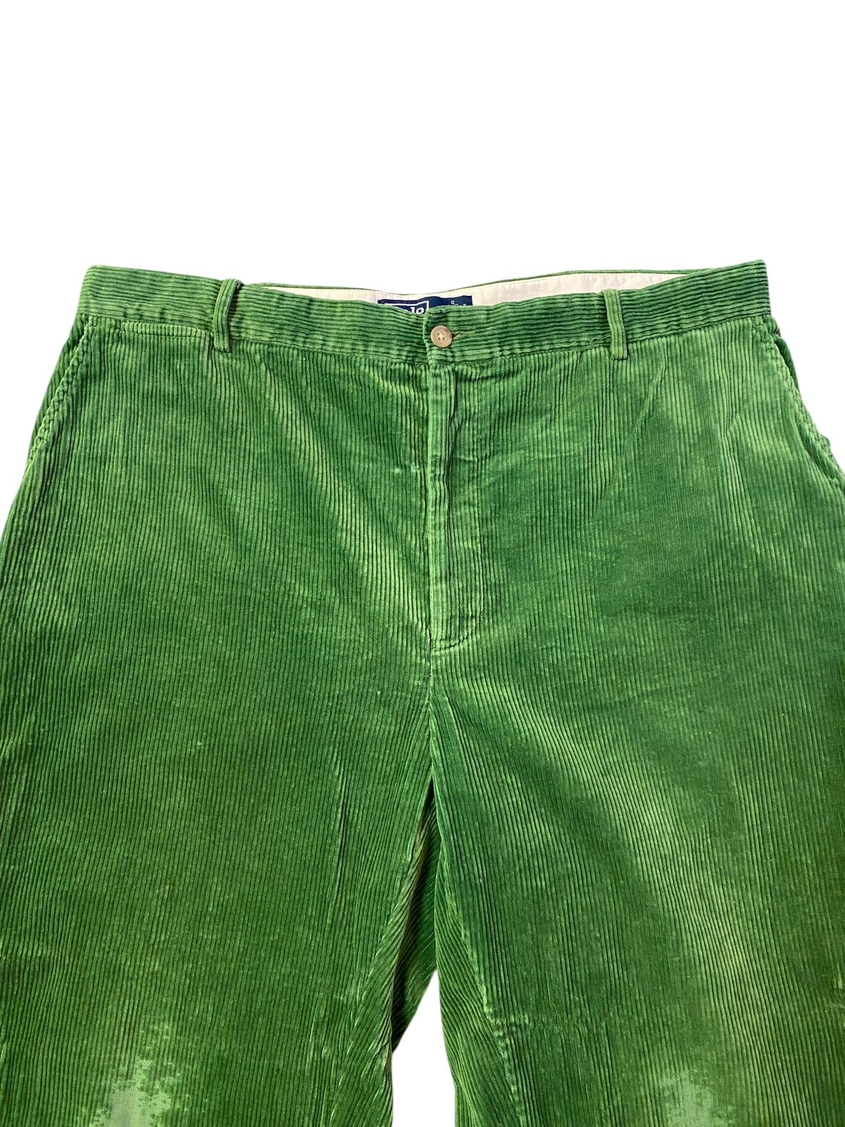 Add a touch of earthy style to your wardrobe with these Ralph Lauren Green Corduroy Pants. Made from soft, durable corduroy fabric, these pants offer comfort and versatility for both casual and semi-formal occasions. The rich green color gives them a unique and stylish appearance that pairs well with a variety of tops. Although there is some knee damage, these pants still maintain their stylish appeal and can be a great option for relaxed, everyday wear.