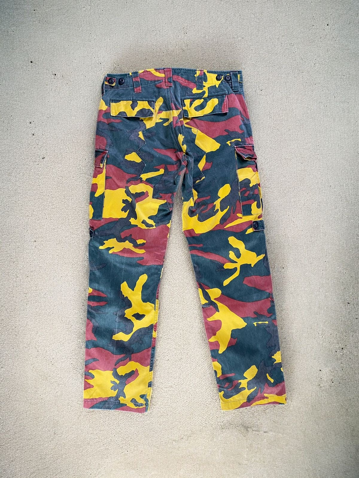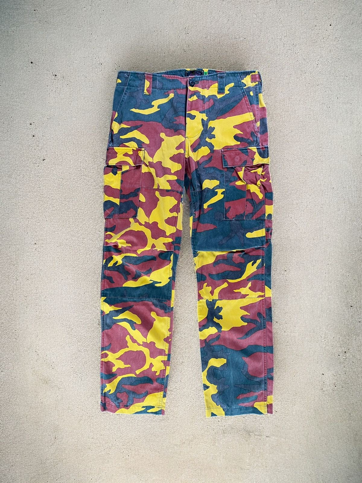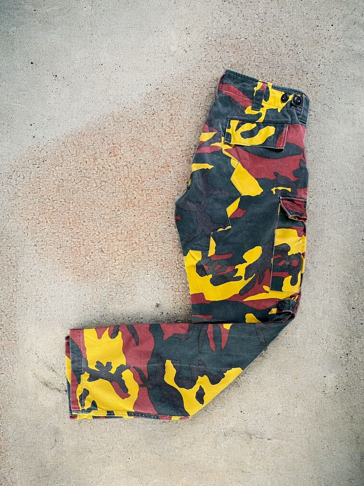 Rotar Pants in a bold camouflage pattern featuring yellow, red, and dark grey/black tones. Eye-catching and durable, these pants bring a statement edge to any outfit.