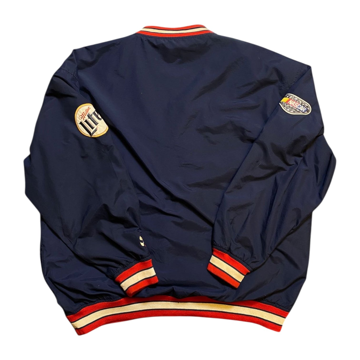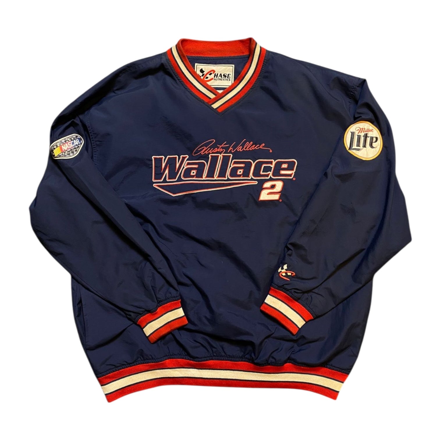 Bold and vintage, this Rusty Wallace #2 navy jumper features classic NASCAR graphics with a roomy, insulated build for race-day style and comfort.