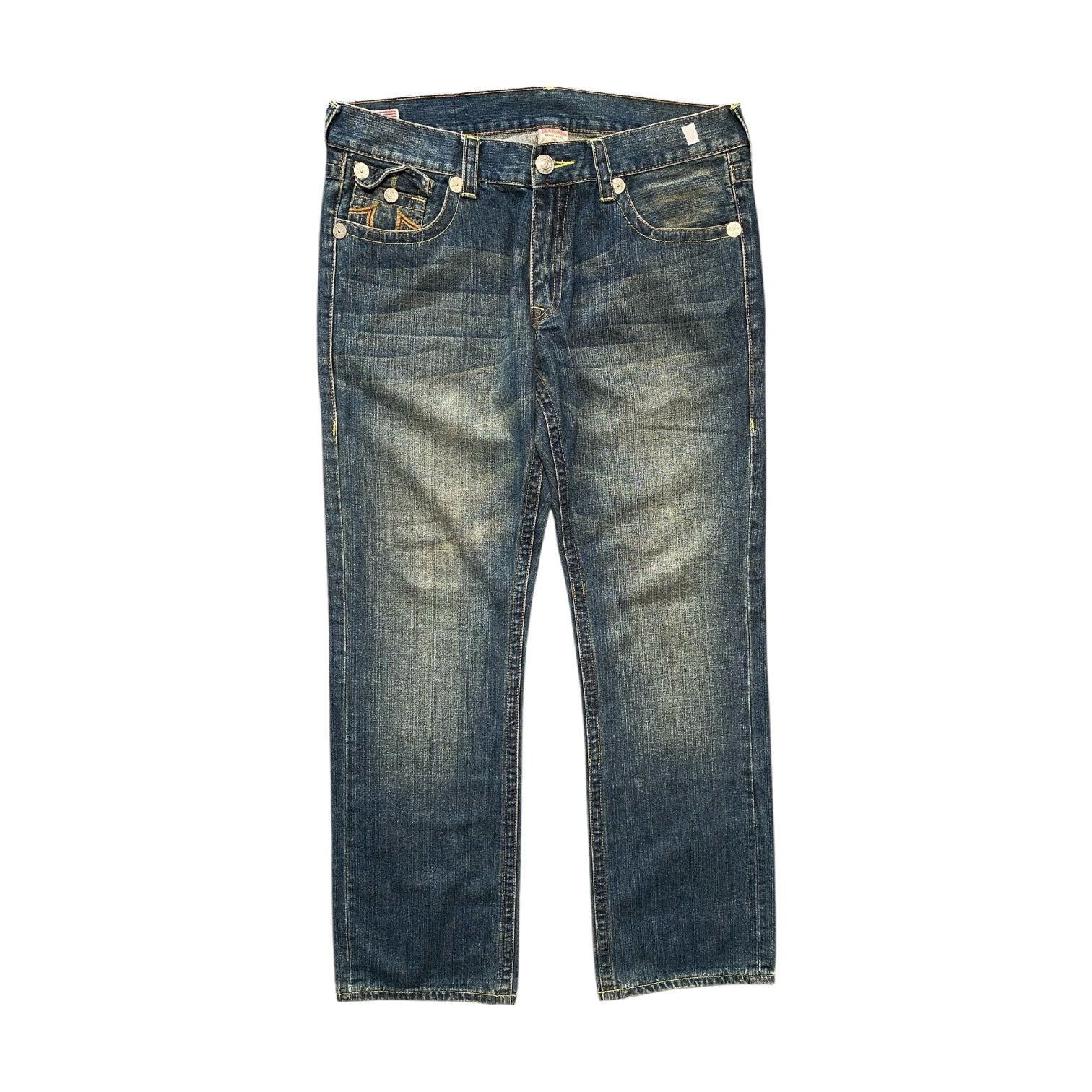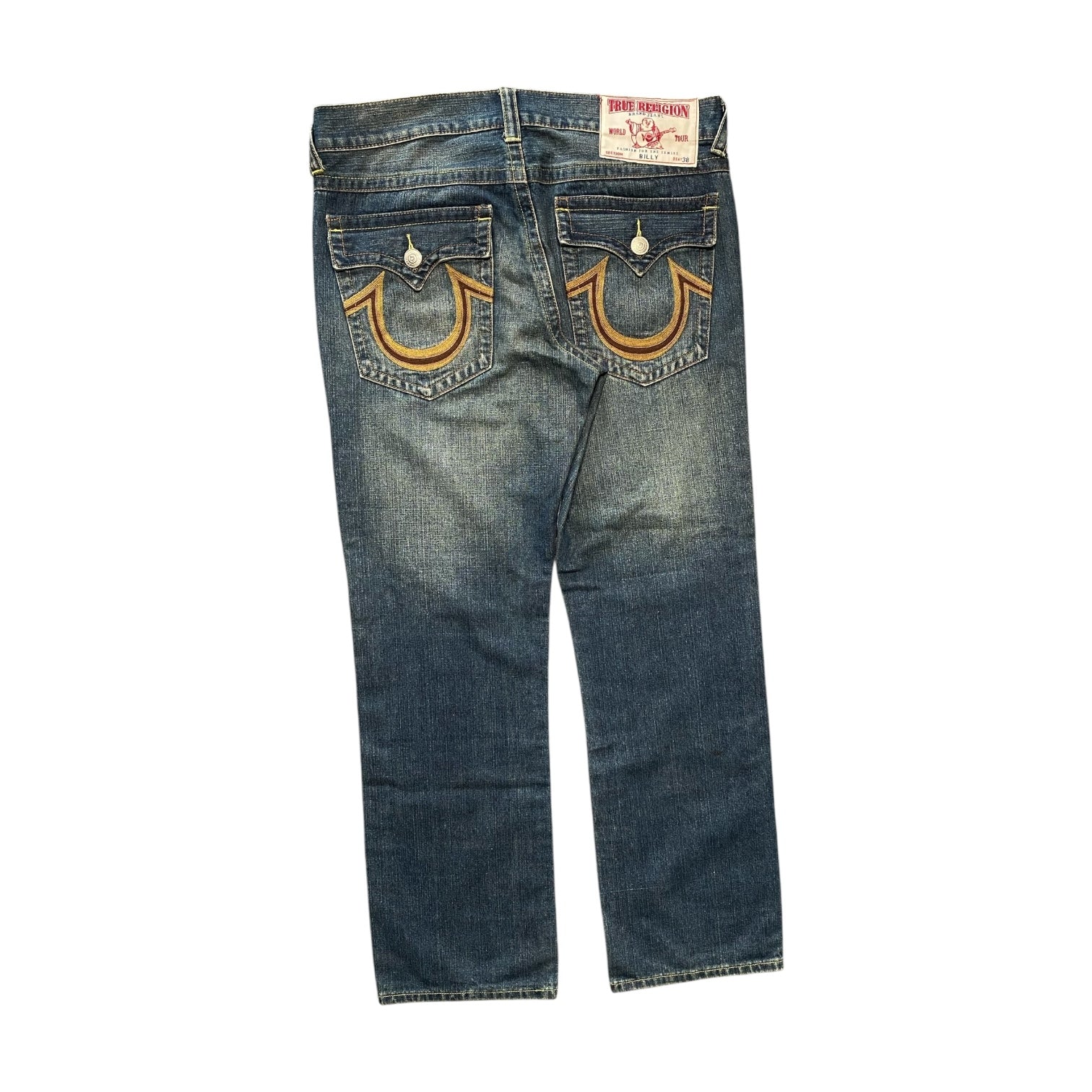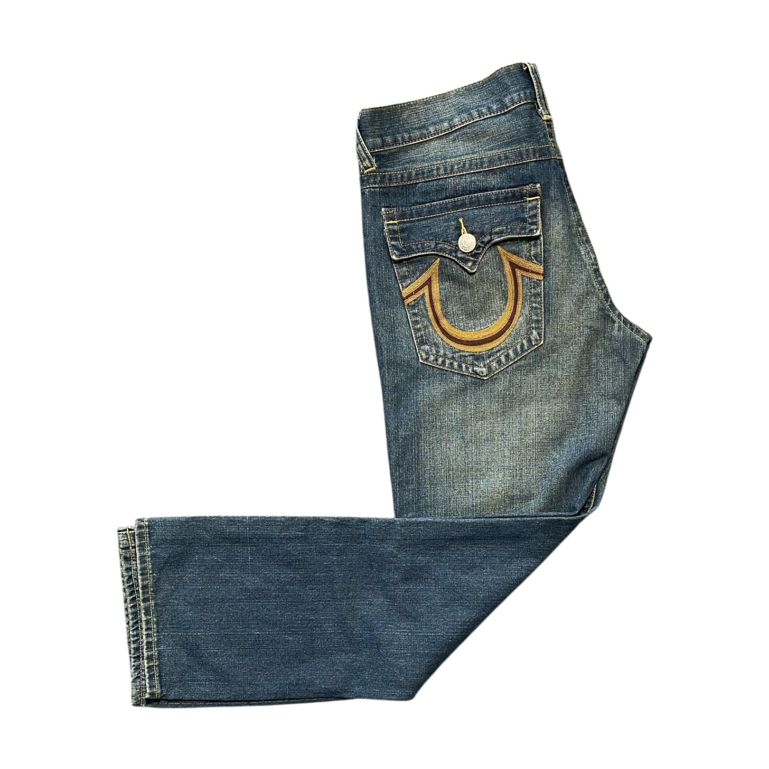 Bold True Religion denim jeans featuring standout neon stitching and a comfortable fit, perfect for making a style statement.