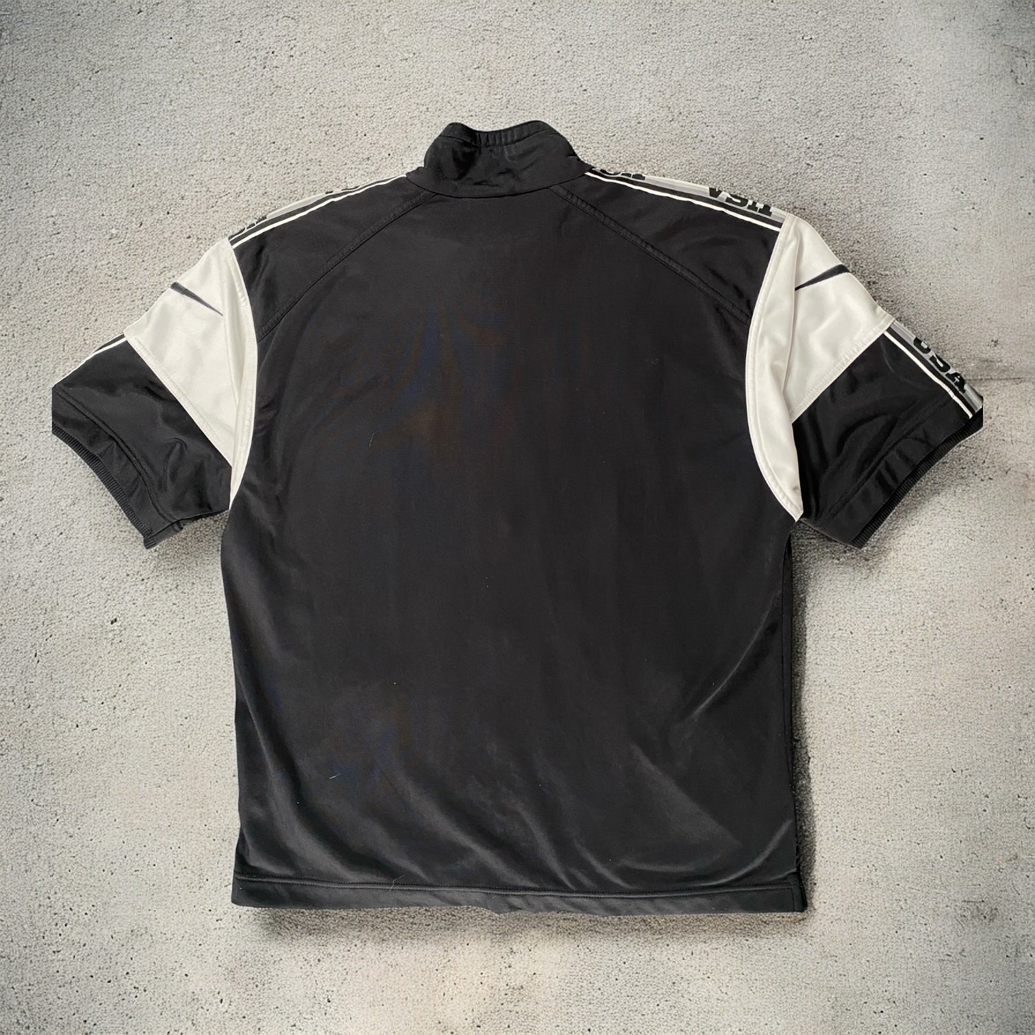 Classic 90s Nike short sleeve track shirt featuring the Swoosh logo, offering vintage Y2K streetwear style with an oversized fit.